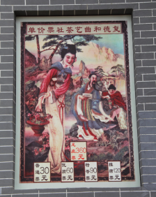 还有仿旧时当铺式的售票间,那副对联写着:大丈夫仁中取利,真君子义内求财。曲艺茶社主人的情怀与胸襟,跃然于纸上。